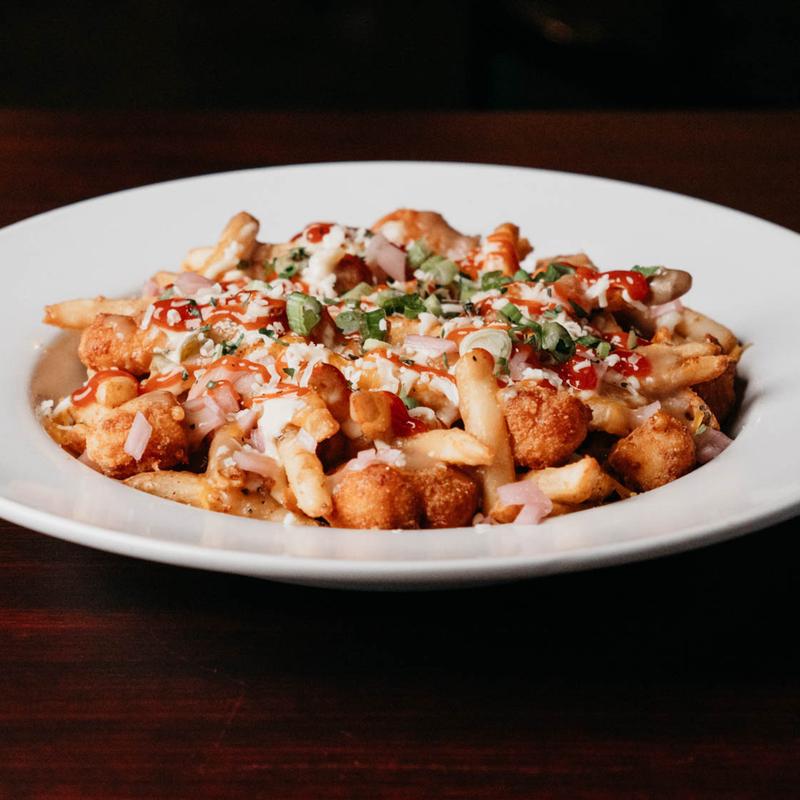 Loaded Fries with Gravy, Beer Cheese, Cheese Curds, More Cheese, & MORE Cheese on top of that. Topped with Ketchup, Garlic Aioli, & Pickled Red Onions
